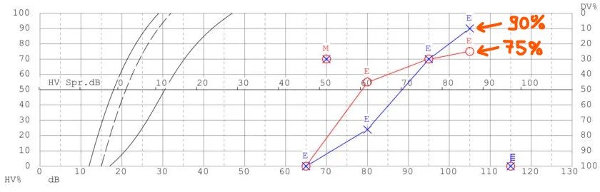 Wenn du dir das Sprachaudiogramm ansiehst, ist irgendwo ein Punkt mit der maximalen Verstehquote eingezeichnet. Das ist etwas das, was man mit Hörgeräten erreichen kann; vielleicht etwas mehr, vielleicht etwas weniger.