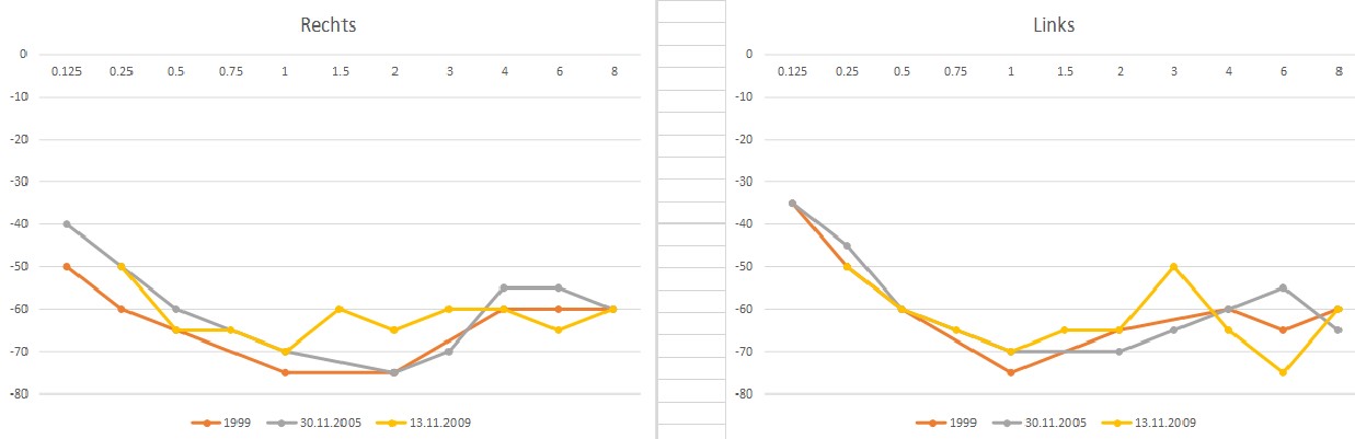 Wieso werden deine Kurven im Lauf der Jahre zum Teil besser? (Heul, Neid :'( ) Jeweils 10dB sind immerhin eine Halbierung des nötigen Schalldrucks. Bei mir gibt es über die Jahre hinweg ausschließlich Verschlechterungen.uninteressant hat geschrieben:Meine Kurven der letzten Jahre: