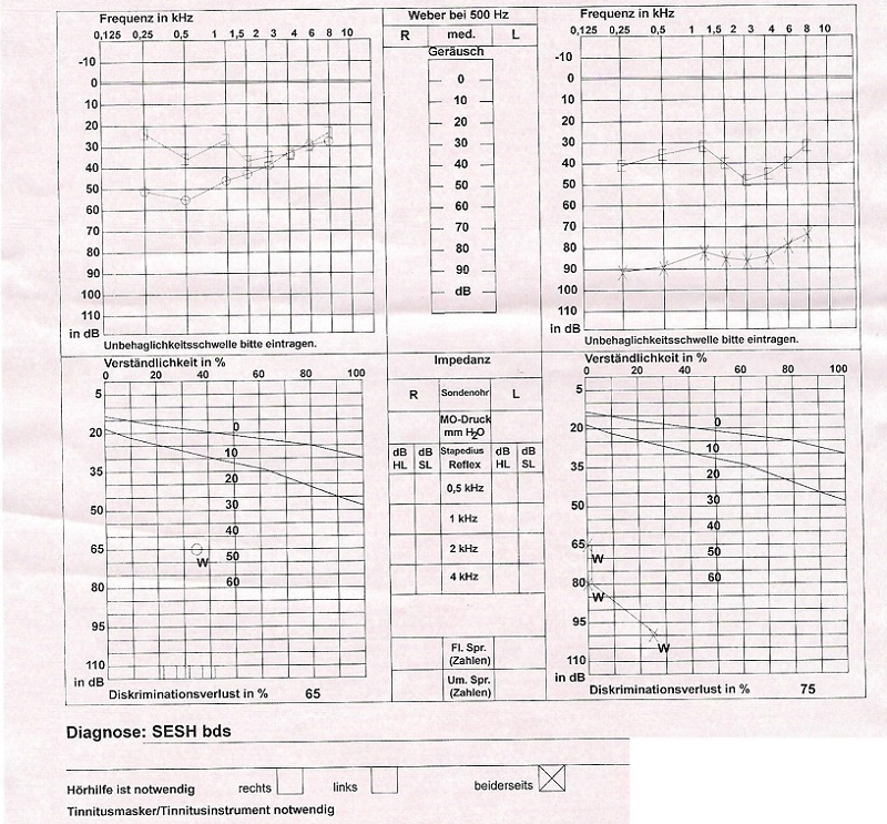 zur Ermittlung des GdBs auf Grund von Hörstörungen dürfte in Deinem Fall das Sprachaudiogramm massgeblich sein. Das eingestellte Audiogramm genügt jedoch den Anforderung des Versorgungsamtes nicht, da folgende Werte vorhanden sein müssen: