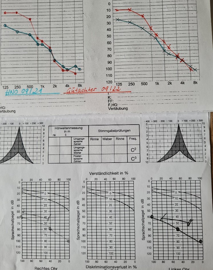 Angehängt sind die Tonaudiogramme ( habe beide al zusammengefasst, weil ich sie Unterschiede schon erstaunlich finde, sowie das Sprachaudiogramm).