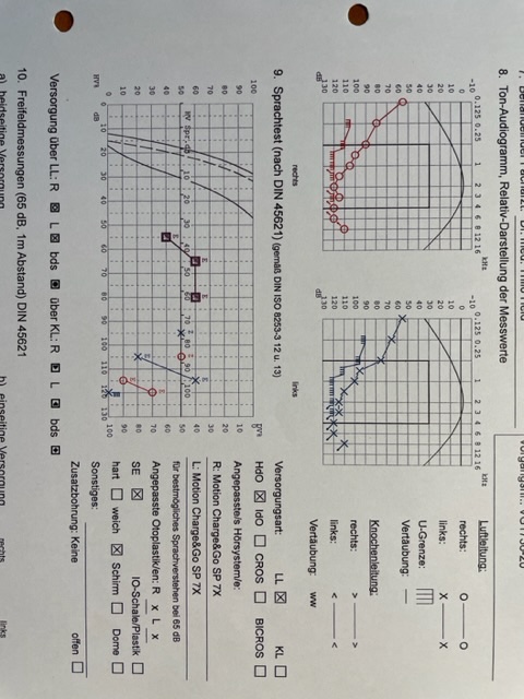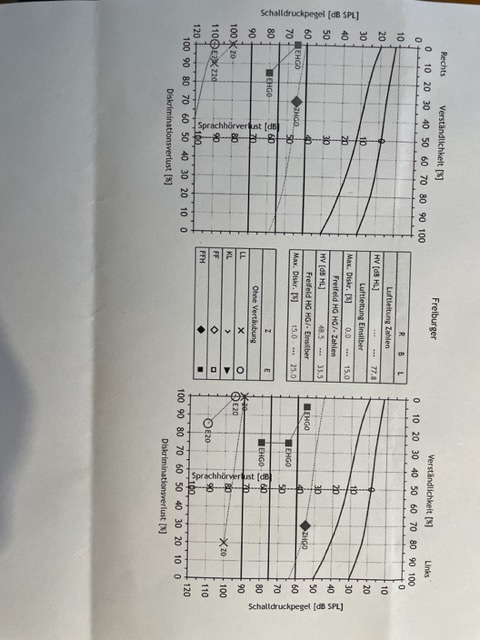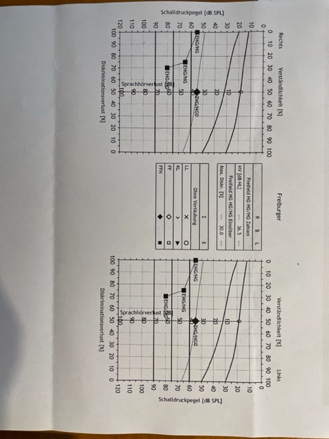 Der eine Test wurde vom Akustiker mit Hörgerätepaar Nr. 1 gemacht der andere von einer Uniklinik zur Abklärung wegen CI Indikation mit Hörgerätepaar Nr. 2…… ich hoffe trotzdem, dass die beiden Tests vergleichbar sind und ersichtlich ist, welches Hörgerätepaar beim Freiburger Test besser abschneidet…..