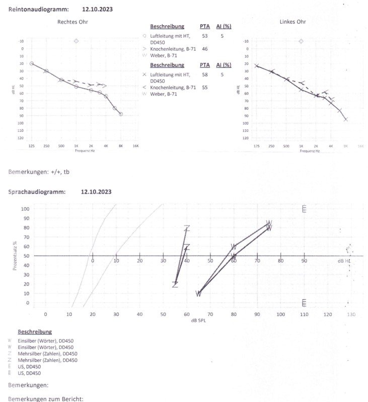 Laut den oberen Daten komme ich (Ablesefehler vorbehalten) auf rechts 77% und links 79% und laut den unteren auf rechts 62% und linke 72%. Laut Tabelle D beides jeweils ein GdB von 50, nur zählt in der Regel nicht das schlechtere Ergebnis sondern dass der Sprachaudiogramme. Und ganz wichtig: nicht älter als zwei Jahre und dazu bevorzugt vom HNO Arzt.