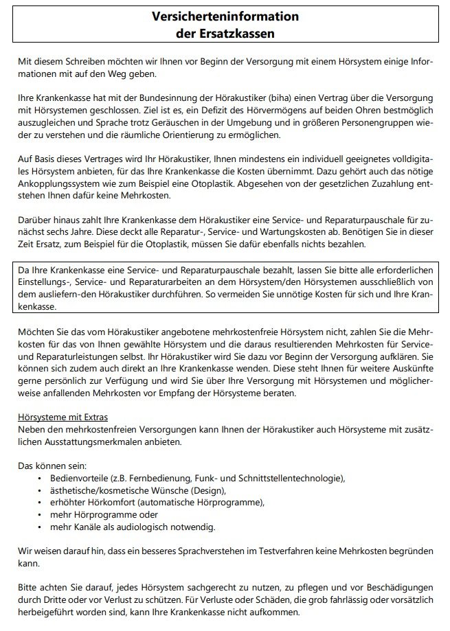 An dem Punkt unterscheiden sich die diversen Dokumentationen die als Versicherteninformation bezeichnet werden zwischen verschiedenen Hörgeräteakustikern. Und so klar wie es oft notwendig wäre steht es auch nicht wirklich drin.