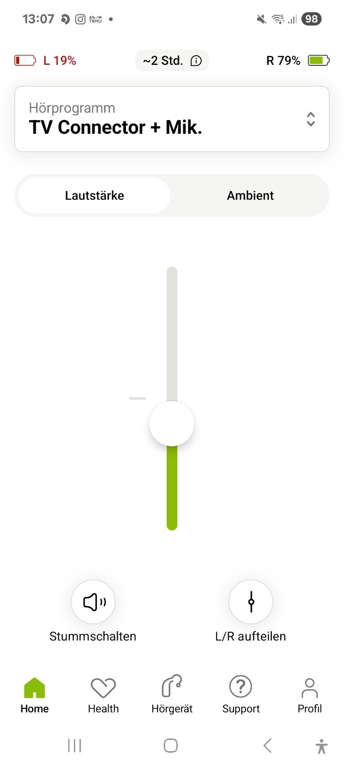 Das kann beispielsweise über einen längeren Tastendruck am Hörgerät erfolgen. Der Tastendruck startet/stoppt den Stream. Ebenso kannst du mit der Laut/Leise-Regelung die Lautstärke des TV-Signals erhöhen/reduzieren und gleichzeitig die Umgebungsgeräusche reduzieren/erhöhen.