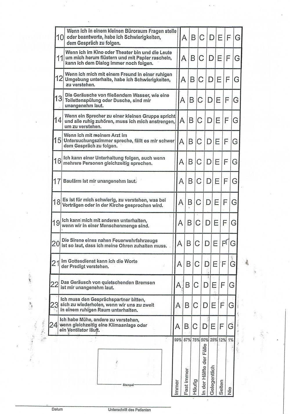 Habe nach einem Hörtest (unten angehängt) eine HG Versorgung bekommen und einen Fragebogen der Vor der Versorgung sowie nach der HG Versorgung auszufüllen ist (ebenfalls angehängt)